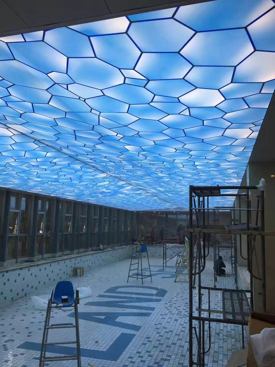 一般在工裝的工程當中大部分都會用到軟膜天花,燈光膜,因為這種材料不但安裝方便,照明空間大,而且容易維護,最主要的是它能大面積的使用,做出非常好的效果,只要你設計得當,有足夠的想像力,效果絕對出眾,一般情況下大多數(shù)都是用在公共場所,可以做出各種造形,畫面色彩千變萬化,隨心所欲.